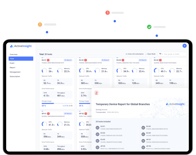 通过集中化网页门户,管理和监控所有 Synology 设备的性能、使用情况、登录活动、存储利用率、备份状态以及其他重要方面。